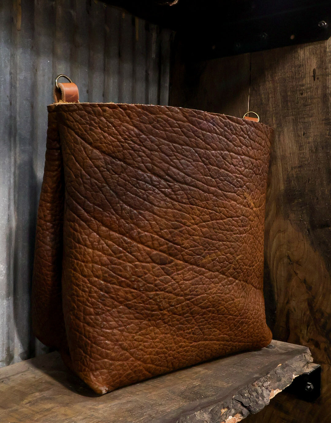 This sturdy tote comes from a bison hide with a lot of texture to give it an eye catching depth.